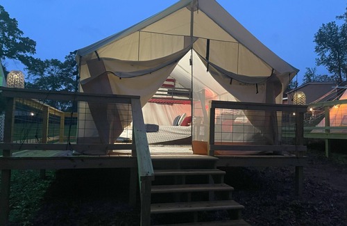 Consider this campground your home away from home while you visit Eufaula. The Patriot is Veteran Owned with a breathtaking waterfront. Glamping directly on Lake Eufaula shared with the Anchor and Redfish tents. GrandView Glamping connects us to nature by using a tent - a canvas structure that brings back those memories of true camping but with some comforts from home. Through the woods you can see the water and easy access to the lake by waterways. This cozy retreat features 1 bunk bed with full and twin beds, and 1 sofa bed in the bedroom, along with 2 bathrooms equipped with showers. Enjoy the convenience of amenities like coin laundry, AC, heating, a washing machine, and WiFi. Fall in love with Eufaula and enjoy the magic it has to offer.