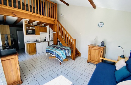 A stone's throw from the beach, you will find this lovely pavilion in a residence with a swimming pool. This accommodation has a parking space. You will find, on the ground floor: living room with kitchenette equipped with a frigotop, fridge-freezer, washing machine, dishwasher, mini-oven, microwave, Television, shower room with Italian shower, independent toilet, one bedroom with 1 bed 140cm. Upstairs, small mezzanine, one bedroom with 1 bed 140 cm + 1 bed 90cm. Terrace with garden furniture, barbecue, awning and access to the residence's swimming pool. Close to the resort centre. 2* classification. Ideal for a family wanting beach and pool comfort with walking access to the resort centre. The residence's swimming pool is operational from 15 June until the end of September.