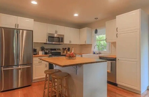 Find yourself right at home in this open floor plan. First, enjoy the lovely country kitchen which features butcher block countertops, a large farmhouse sink, an island with two barstools, and new stainless-steel appliances with an electric convection stove. Through most of the home you will find recessed dimmable lighting to adjust to your lighting needs. The adjoining living room features a brick wall with a wood burning fireplace, for those cold nights, and a 60-inch 4k smart television. To enjoy a nice sit-down meal, the dining room has seating for 4. Lastly, the Master bedroom features a private en-suite with double vanity sinks and the guest bedroom has two twin beds that can be pushed together for couples. There is also a queen sized air mattress which can be setup in the living room.