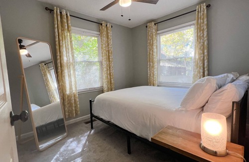 This cozy and stylish cottage is centrally located to downtown Asheville, the Biltmore, and Bent Creek. Enjoy relaxing in this well equipped and comfortable 3-bedroom, 2-bathroom home, surrounded by natural serenity. The expansive backyard, fire pit, and two patios provide the perfect place to unwind. Soak up time with loved ones by the fire while you plan your Asheville adventures. Mountain biking, hiking, shopping, & dining awaits just a short distance away! Enjoy Wi-Fi & a Smart TV! All living spaces are on one floor. 3 bedrooms total. The master bedroom has a king bed and an attached bathroom. The other two bedrooms each have a queen bed. An additional full size bathroom is off of the hallway. Fully equipped kitchen and dining area allows for guests to dine in. The living room includes a Smart TV. There is a porch off the front of the house and a deck on the back, overlooking the spacious backyard. Below the main level is a garage, available for you to store your bikes and kayaks!