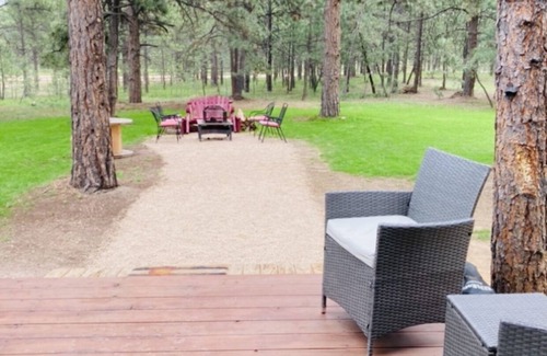 Experience Colorado Living, Plenty of outdoor space and Tall Ponderosa Pine Trees, peaceful feel, property is frequented by Deer and other wildlife. Wood burning fire-pit area to toast your marshmallows, private Deck with BBQ grill. Play some corn hole, horseshoes or have fun jumping on the trampoline! You’ll be staying in our 3bd 1ba Mountain themed ranch style guesthouse (separate home across the driveway on acreage)