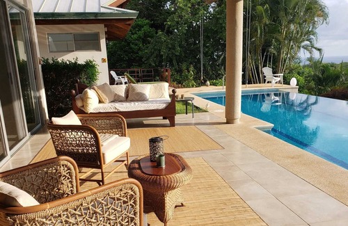This House offers jungle and ocean views and unforgettable sunsets . You hear crashing waves and will be able to swim in a 60' infinity -edge lap pool, always with perfect swimming temperatures and for lounging upon. The House sits 300'up and 1/2 km back up from the ocean near perfect year-round temperatures. all concrete construction with wood and AC in both bedrooms . the House stays cool all day long. Lush tree canopies attract monkeys and bird close. The sound of nature will prevail.