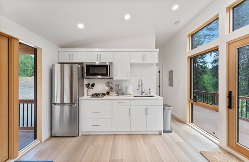 With 685 square feet of space, two bedrooms, and one bathroom, this remodeled cabin comfortably accommodates up to two guests.