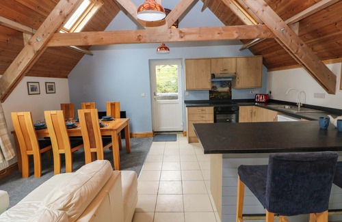 Pendre Barn consists of a kitchen with an electric oven, electric hob, fridge, freezer, dishwasher, kettle and toaster, a utility with a washing machine and tumble dryer, a dining area with seating for six, and a sitting area. The bedrooms include a ground-floor king-size with an additional sofa bed, a first-floor king-size, and a twin with en-suite walk-in shower, basin, heated towel rail and WC, along with a bathroom with bath, shower over, basin and WC. Outside, there is an enclosed rear garden with a lawn and picnic bench, and off-road parking for 2 cars. Within 3.6 miles, you will find a shop, and within 1.6 miles, a pub. WiFi, fuel, power, bed linen and towels are all included in the price. A highchair, stairgate and travel cot are available on request. Three well-behaved dogs are welcome. Sorry, no smoking. A joyous getaway awaits at Pendre Barn. Note: There are steps down and up on the way to the garden, please take care.