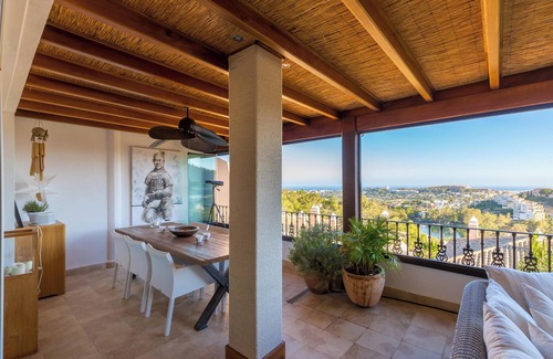 The duplex penthouse is furnished with high luxury furniture and has an amazing covered terrace with breathtaking view over the sea, golf courses and the African coast, it also has great sun terrace to enjoy sunbathing.