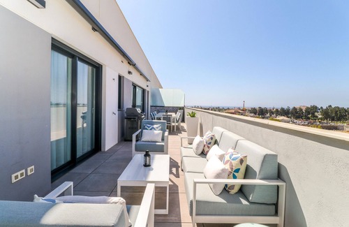 Penthouse with large rooftop terrace and private pool is located in La Cala de Mijas. Penthouse with large rooftop terrace and private pool provides accommodation, featuring Fireplace/Heating, Barbecue/Outdoor Cooking, Kitchen, among other amenities. This Apartment features Fireplace/Heating, Barbecue/Outdoor Cooking, Kitchen, to make your stay a comfortable one.