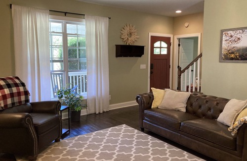 Entire 1st floor of a cute farmhouse nestled in a quiet mountain neighborhood. Enjoy the sound of crickets or peepers in the spring and summer or the rustling of leaves in the fall. We even enjoy an occasional snow fall in the winter months of January and February. If you feel like venturing out of this restful retreat, you’ll be only minutes from the Blue Ridge Parkway, 15 from Biltmore Estate or Downtown Asheville, 20 from Black Mountain, and under 30 from Chimney Rock and Lake Lure. Full kitchen with dining room table, living room, and front porch with rockers. Come for Asheville’s hiking, sights, and treats, then cone home to rest and relax.