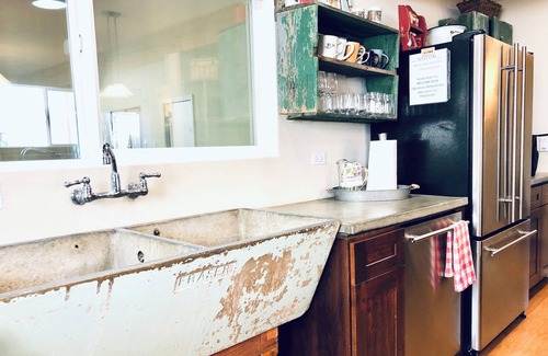 The open well lit living room draws you in to a comfortable and rich area with couches and chairs circling the propane fireplace. The dining room just calls out for the family to pull up a chair and sit together over a home cooked country meal. The open floor plan allows guests to dabble in the kitchen while visiting with others in the living room and dining area. There are even counter stools, ready for you to pull up and sit for a while. The kitchen is a delightful step back in time, while boasting all new appliances. The sink is an amazing old washtub and the cabinets mix a touch of old and new. The appliances include a large refrigerator, a dishwasher and an oven/stove.