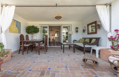 Our apartment is located in the front-line beach luxury complex called La Perla de la Bahía. It is a ground floor with two bedrooms and a marvellous panoramic view of the sea and the beach. It has a private garden. The apartment has been decorated very tastefully and it is located in a quiet area.The bedrooms have double beds and spacious fitted wardrobes with en suite bathrooms. The bright living room has a big sofa and lounge chairs in front of the chimney, a dining table with chairs.The apartment has a spacious and fully fitted wooden kitchen and a utility room. From the sunny terrace you will enjoy the beautiful views of the sea. You can access to the terrace from the bedroom and the living room. In the terrace you will find a table with 4 chairs, a comfortable sofa and 2 sunbeds.The community has four big swimming pools (one is heated), communal gardens, and direct access to the beach.The property is fully air conditioned/heated, it comes with an underground parking space, private WIFI connection and it is located next to 2 beach restaurants and the Finca Cortesín, a 5 stars beach club hotel.