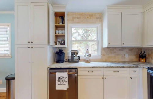 Throughout your stay you'll have full access to the entire home with its huge, open-concept living room, eat-in island, dining room and kitchen; kitchen is fully stocked with silverware, plateware, K-cup and standard coffee maker, pots/pans, and cookware! Dishwasher in the kitchen, with starter pods included, to make dinner clean up a breeze!