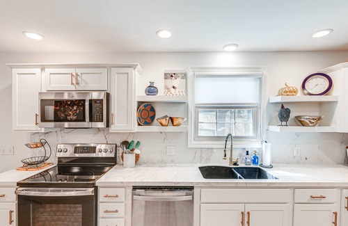 Find the perfect blend of comfort and convenience for your extended stay at this modern 4-bedroom, 2-bath vacation rental in Hermitage, Tennessee. Located in a quiet neighborhood, this bright and charming duplex features desks for remote work, a peaceful deck, and a fenced yard for pets! When you're ready to head out, take a short drive to Andrew Jackson’s Hermitage, or enjoy the vibrant nightlife in downtown Nashville. Return home and end the evening with a movie in the spacious living room!