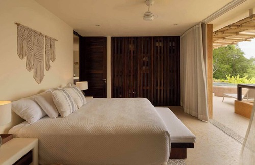 Architectural details abound, such as local and handcrafted raw marble floors, river stones, and parota wood. As you enter the bright living room, your eyes will be drawn to the views and the beautiful outdoor space. Retractable glass doors enclose the air-conditioned living-dining-kitchen area. The spacious indoor/outdoor terrace with a private heated pool and loungers is the perfect place to enjoy the views and tropical birds while having your morning coffee, evening cocktail, starlit dinners, or all of the above. The luxury kitchen is well-equipped with a super-automatic espresso/cappuccino machine for your morning lattes. The kitchen is stocked with essentials like salt, pepper, good quality olive oil, and of course, an electric juicer, a blender for smoothies, and a lime press and cocktail shaker for margaritas. You will find tableware and glassware for 8 people, as well as ample cookware and utensils. High-quality appliances include a dishwasher, microwave, toaster/air fryer oven, and a stacking washer/dryer. You will also find a filtered water faucet in the kitchen and beautiful pitchers in all bathrooms for drinking water. Enjoy your music with a wireless Bose speaker. Connect to high-speed internet and WiFi throughout the apartment. A handcrafted parota wood dining table for 8, and a comfortable L-shaped sofa and armchair complete the living space. The 3 luxurious suites are air-conditioned and consist of two master suites (both with terrace access and views), and one with two single beds (which can be converted into a King bed). In all rooms, you will find luxury bedding and mattress, a flat-screen TV for your favorite shows, a small safe, closets, and storage space. Large rain showers, plush towels, bathrobes, and raw marble countertops give the bathrooms a luxurious spa feel. The bathroom attached to the room with two single beds is also accessible from the main hallway.