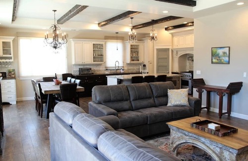 The 3-bedroom, 2-bathroom home can comfortably accommodate up to 8 guests, but there’s room for even more with additional air mattresses (provided). This home is very well organized for groups with an open floor plan inside and plenty of room outside for you to spend time together. The main attraction is the sensational back yard which offers several seating areas and a calming atmosphere with amazing views. It’s the perfect spot to relax with your morning coffee under the covered patio, read a book in the gazebo, play a game of bocce ball or relax around the fire pit under a starry sky.
