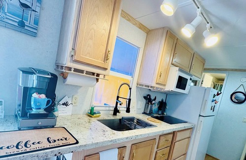 Camper in Calusa Campground with all the comfort of home, outdoor kitchen, outdoor sink, fridge outdoor, sitting tv and more. The trailer is located within walking distance from all of the community amenities. You can relax on the hammock lounge, enjoy a drink by the fire pits or sunbathe on the sundeck!
