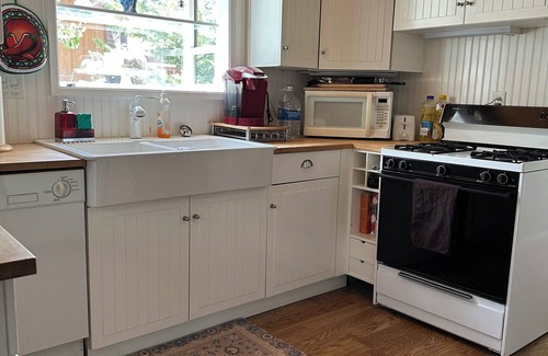 The 2-story cabin features a high ceiling living room where you can get cozy in front of a roaring fire and enjoy the big screen tv. The downstairs has 1 bedroom, 1 bathroom, a fully stocked kitchen with French doors opening out to the deck. The upstairs has an en-suite master bedroom and a den with a queen futon where you can play games and watch nostalgic VHS all time favorite videos. The den looks out through glass high ceiling windows where you can enjoy the falling snow during the winter. You can explore the woods down the steps to the backyard or take your sled down during winter months. Also enjoy a 1 minute walk to charming Green Valley Lake. Pet fee is a one time extra fee of 100 dollars. Extra guest one time fee of 60 dollars for each extra guest. Extra 50 dollar fee for early check in or late check out upon host approval.