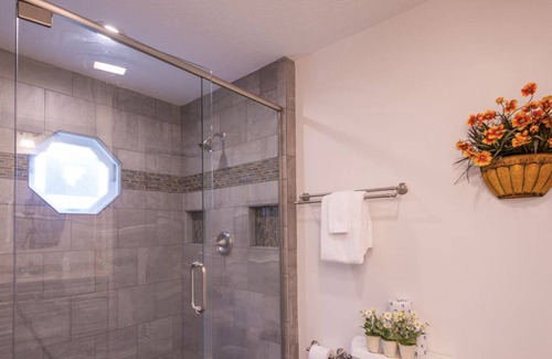 Pine Forest has 3 bedrooms – 1 with a full bed (lower level) and the remaining 2 with a full and twin bed. One bedroom has a beautifully renovated private bathroom. There is also a second full bath down the hall.
