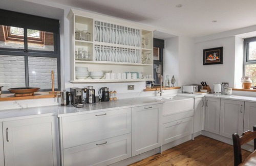 The living areas in the property consist of a kitchen with range, electric oven and gas hob, microwave, fridge/freezer with water and ice dispenser, dishwasher, cafetière, wine fridge, dining seating, and a first-floor sitting room with Smart TV with soundbar and woodburning stove, and a first-floor play area with books, screen, toys and games. The bedrooms consist of a super-king-size, a double with en-suite shower room, and a twin with zip/link, all on the ground-floor, along with two twins with zip/link, and a ground-floor bathroom. Outside, there is an enclosed garden with seating area, garden furniture, barbecue, wood-burning pizza oven, and small lawn, as well as off-road parking for two cars. Within 0.5 miles, you will find a shop, and within 2.8 miles, a pub, and please note that this is a non-smoking property. WiFi, fuel, power, bed linen and towels are all included in the price. Two well-behaved dogs welcome. Travel cot and highchair available on request, please bring own bedding for the cot. Note: Check-in from 4pm, check-out by 10am. Note: The spiral staircase leading up to the sitting room, play area and bedrooms, has restricted head height and may not be suitable for small children.