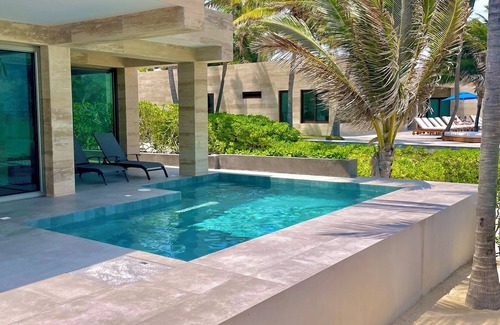 Pamper yourself in this spectacular all new luxury beachfront home located on the sand, right in the middle of the quite residential oceanfront of Playacar Phase one-a true beachfront oasis that is less that a 10 minute walk from the heart of Playa del Carmen's main tourist district. Step out on your spacious oceanfront patio with a full size pool and comfortable outdoor furniture. Take a stroll on one of the most pristine pure white sandy beaches in the Caribbean latitudes. Your master bedroom opens up on two sides to give you a panoramic view of the downtown lights and the lights across the ocean on Cozumel. Your living room and kitchen feel like part of the ocean with the 180 degree panoramic view from your retracting glass wall . Fully air conditioned, WiFi and cable. 2 bedrooms with king beds and ocean view. one bedroom with two double beds and one bedroom with a double bed. Three with walk in in bathrooms attached.Granite counter tops with tile throughout. Large fully equipped chef's kitchen with dining table seats 8. Large swimming pool with patio table and chairs and barbecue. 60 inch LED TV in living room and 52 inch LED TV in bedroom. Beautiful guest bathroom. Washer, dryer. Parking in front. A vacant beach lot on the north side provides additional privacy. Gated community with security guards 24 hours a day. Casa Glenn is a luxury vacation paradise where you will want to return year after year.