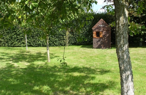 Enclosed garden, children's hut with bikes, scooter, games and swing.