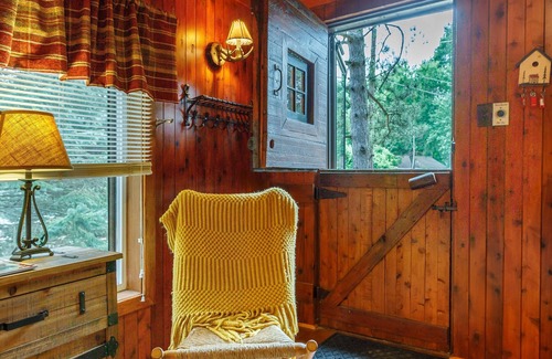 The well-appointed kitchen features an electric cooktop, sink, beautiful custom wood cabinets, fully stocked with pots/pans, flatware, dishes, glasses; small refrigerator, microwave, coffee maker and toaster, waffle iron, crockpot, skillet, toaster oven, hand mixer, and blender. The dinette is surrounded by windows overlooking the beautiful pine trees. There are 2 bedrooms and a sleeping loft, with blankets, sheets and pillows. The main bedroom has a queen-sized bed with two night stands and a supplemental heater, just in case; the second bedroom has 2 bunk beds. The loft is accessible by a wooden ladder and has a queen-sized mattress. Because of the low head room and the ladder access, this area is perfect for adventurous kids. The sofa in the living room pulls out to a queen-sized bed. The bathroom (toilet and sink) is separate from the shower/dressing room and storage.
