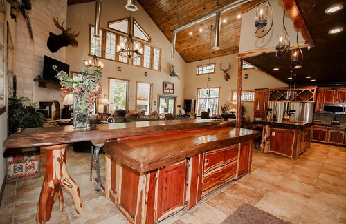 This home features 5 bedrooms, 3 full bathrooms, and 2 half-baths; it now sleeps 33 people! The great room is stunning, fully-furnished with inspiration from King Ranch, giant 5" thick native Pecan counter tops (which are handmade by the owner) and a fully-stocked kitchen and bar area.