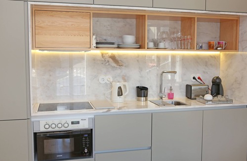 Kichenette equipped with microwave, oven, fridge, dishwasher, espresso machine, toaster, kettle and all the main kitchen utensils.