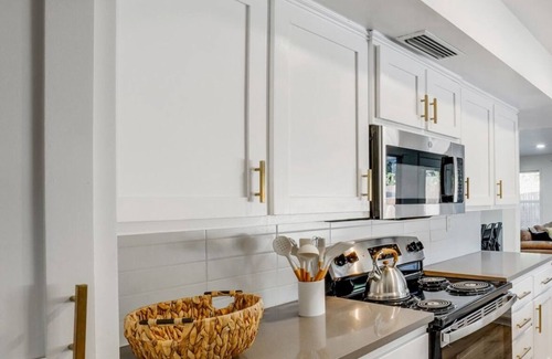 This modern home was recently renovated and designed immaculately, offering a perfect blend of style and comfort. The décor is sleek and homey, creating a welcoming atmosphere for your stay. Complemented by a breathtaking outdoor space, perfect for lounging and relaxing, the grand pool and brand-new hot tub make it ideal for unwinding. The backyard is fenced with a private gate that opens to nature, giving you a true sense of tranquility right outside your door.