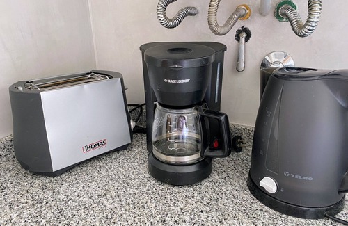 Fully equipped for extended stays, the kitchen includes a new 420-liter fridge (2023), a 7 kg automatic washing machine (2023), and a microwave. It comes stocked with cooking essentials, including pots, and features a small cupboard for dishes and another for cleaning supplies. The kitchen is well-lit with a central window and has an air extractor to improve ventilation while cooking.