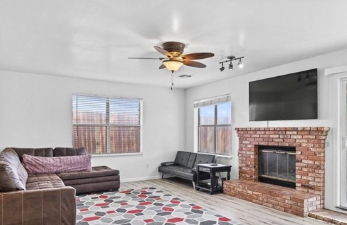 Spacious living room includes a comfy sleeper sofa, 65” Smart TV, a fenced-in backyard, laundry room, high-speed Wi-Fi, on-site parking, and keyless access.