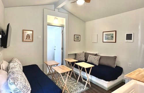 Its a small (340 square ft) but nice and clean space, it has all the necessities for 4 people to visit the area and sleep comfortably. The kitchen has all the needed equipment for daily meal cooking. The main living area has 2 Twin daybeds with memory foam mattresses (75"x38"). There is a bedroom with a queen foam mattress (60"x80") and a private laundry area that can double as a small office with table and 2 chairs. There is a private gated courtyard with table and chairs for 4 and a private parking area for 2 cars.