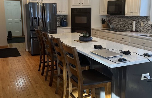 Quiet and cozy home with lots of indoor and outdoor space! Features 6 bedrooms, 4 bathrooms, home office, loft, 2 floor to ceiling stone gas fireplaces, lots of windows, deck with outdoor seating, large finished lower level with pool table, couches, tv and stereo system with access to the large patio area with a cozy hammock and fire pit, 3 bedrooms are located on the lower level and 3 on the main level, large kitchen island with seating plus dining room table that seats 6 people,