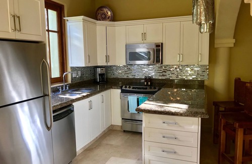 Loreto Bay is a beautiful development a few kilometers south of the town of Loreto, situated on the Sea of Cortez midway down the Baja peninsula. FN 327, a Casa Chica in the Founders neighborhood of Loreto Bay, is a light, bright, peaceful 2 bedroom, 2 bathroom Casa, just steps from the Paseo, the bay, and the golf course, with mountain views from the second floor patio. It is 1,400 square feet of living space in a tropical oasis. This Casa features white kitchen cupboards, contemporary lighting fixtures, granite countertops throughout, stainless appliances, and light travertine floors in all rooms and patios. It is well furnished and appointed: newer flat screen, Smart TV, 6 seat dining table, both bedrooms include king size beds, armoires, connected bathrooms, each with two sinks, large walk-in showers, and large soaking tubs. The first floor includes a private entrance and patio, an open floor plan in the living area, and a bedroom/bathroom. The second floor is accessed via outdoor stairs from the lower patio. It includes a very private bedroom/bathroom, a large deck with an outdoor shower, outside seating under a shade structure with a chandelier, and spectacular views to the west. The living room and each bedroom has its own air conditioning unit. There are ceiling fans in the living room, in each bedroom, and in each bathroom. Two beach cruiser type bikes, with tire pump, are included with the Casa. There is a propane BBQ on the main floor patio to enjoy outdoor grilling. There is also a folding utility cart for transporting items from car to casa and vice-versa.