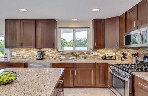 An updated eat-in kitchen features stainless steel appliances, granite counter tops, and a large center island with additional seating. Large windows let in plenty of light with views of the outdoor citrus trees and mountains. There is ample room for guests to hang out in this well stocked kitchen with everything you need at your fingertips. You can roast a turkey, bake a pie or serve up blended happy hour drinks! It’s up to you. A full length glass door opens out onto the pool and covered patio.