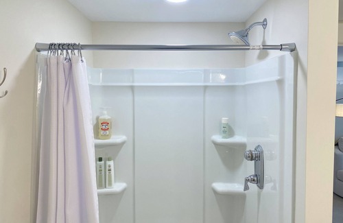 The spacious full bathroom has heated bathroom floors and a large vanity. The shower is equipped with shampoo, conditioner, and body wash. Fresh towels will be provided.
