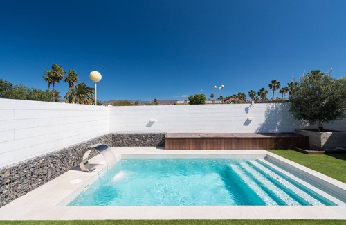 Modern villa or house with private pool on one level, located in a very quiet residential environment and just 5 minutes by car from the famous Dunes and Playa de Maspalomas in Gran Canaria and 2 minutes from the golf course. It is a private house that covers more than 350 m2 of plot, stands out for its comfortable equipment and its spaciousness. It also has a large private pool with hydromassage and an outdoor terrace with a barbecue.
