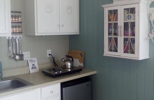 The Country View Cottage is decorated in serene relaxing aqua green and blue. Great view from bedroom window. And off the private deck. Chickens and farm cats wander the grounds freely. No indoor animals have been in any of our Cottage Suite. Free cage farm eggs are provided in suite when available. Suite has fully stock kitchen two burner hot plate microwave, small frig/freezer and appliances make it prefect to cook your own meals or appetizers.