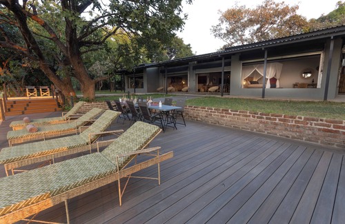 The spacious lounge and dining area opens onto an exterior wooden deck and private infinity saltwater pool, both of which overlook the adjacent South Luangwa National Park and Luangwa River floodplain, a busy wildlife crossing point. The shaded outdoor terrace is furnished with loungers and outdoor furniture. Off to one side of the terrace is a large brick braai/barbecue and outdoor cooking area.