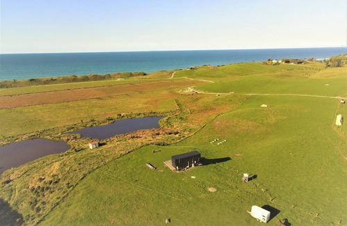Just 1km off state highway 2, is a black box Tiny House as cute as button, perched on a wee hill overlooking beautiful farmland and the Ocean.