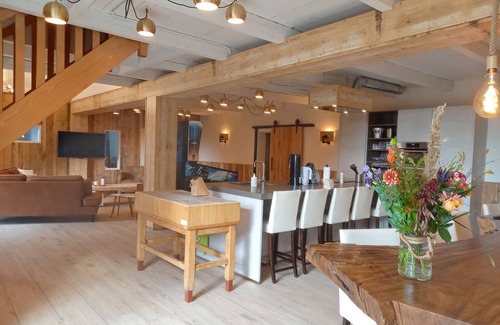 Entrance through the conservatory into the very spacious living room with seating, large open kitchen with cooking island, large tree trunk table (12 pers) with armchairs, large sitting area, relaxing armchair, low tree trunk table, fireplace (gas), flat screen TV 55 inch (digital, international channels + Netflix), open staircase, large patio doors to the terrace, 3 x double bedroom with king-size double bed. Also access to 2 complete and luxuriously furnished bathrooms with 2 toilets, 2 rain showers with hand showers, 2 x double sinks, and a large whirlpool bath through loft doors. Separate toilet, laundry room with washing machine and tumble dryer can also be found downstairs. Also on the ground floor you will find the 8-person Finnish sauna, which you can book as an extra option during your stay.