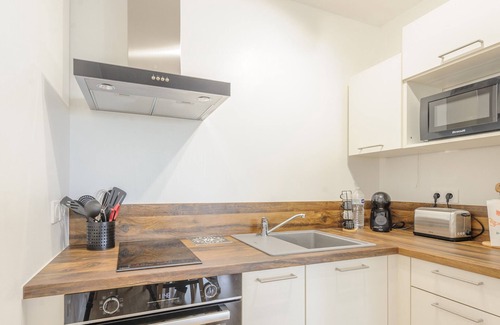 A well-equipped kitchenette (induction hob, oven, microwave, coffee maker, toaster, fridge/freezer) and plenty of storage space.