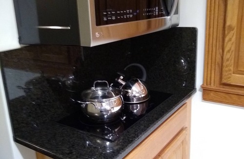 We provide at no extra charge, dry cereal, bottled water, tea, coffee (K-cups), hot chocolate mix, and popcorn. There is a Keurig for coffee, plus a 4-slice toaster, 2-unit induction cooktop, tea kettle, espresso pot, dishes, silver, pots and pans, a full-size refrigerator, blender and a microwave. There is no oven.