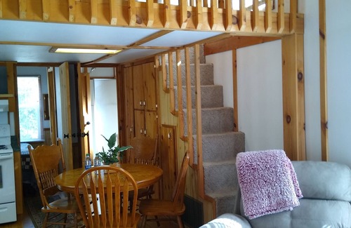 "Raccoon Run" has a covered porch w/ built in seating...once inside the living room is there is a dual reclining sofa, and a recliner in front of the electric fireplace and flat screen TV, with the staircase going to the kiddie loft with a queen size bed. The loft is for kids because it has a ceiling height of 4ft 2in. Walk through the living room and the fully stocked kitchen into the bedroom with a queen size bed and a flat screen TV. The bathroom is accessible from both the living area and the bedroom.