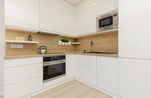 This beautiful flat is located in a building situated on Rajska Street in Lodz. It is an attractive location with numerous restaurants, cafes and service points. The area is very well communicated with other parts of the city, there are many bus and tram stops. The nearest stop is only 160 metres from the building. In the vicinity of the flat there are grocery shops, such as Żabka (350 m), which will satisfy all the needs of our guests during their stay. The city centre, i.e. the famous Piotrkowska Street, can be reached in 20 minutes by car. This is a place that is certainly worth visiting while in Łódź. Here you will find, among other things, a unique mirrored courtyard called the Passage of Roses, the Central Museum of Textiles in Łódź, or excellent restaurants offering cuisine from all over the world. After a day of sightseeing in this unique city, we can take a break from the hustle and bustle of the city by going to the numerous green areas located near the flat. In its surroundings, you will find the Adam Mickiewicz Park, which offers beautiful paths stretching in the midst of nature, two water reservoirs, playing fields and also cafés. It is an ideal place to spend a pleasant and active time with the family.
