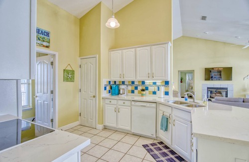 Comfortable and beautifully decorated, this 3br/2ba family vacation home offers a large living space that includes a dining room, fully stocked kitchen with a large bar, and an area with a game table perfect for card playing, board games or another dining option.
