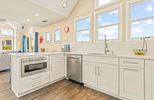 The renovated kitchen is well stocked for year-round cooking, while the open great room and dining area provide plenty of space for meals and conversations. Each of the nine Smart TVs—one in every bedroom, plus the great room and rec room—makes it simple to wind down after the day's adventures. Guests also note the attention to detail: puzzles, games, and books for all ages, a second full-size refrigerator and freezer in the laundry room, and clean, well-maintained furnishings that compliment a beachy escape.
