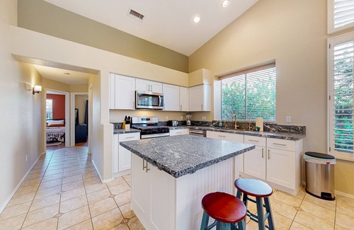 Step into this little piece of paradise and feel right at home in the open-concept sunlit living area, complete with high ceilings, plush seating, and elegant desert decor. Snuggle up on the sofa to stream your favorite movies or break out the board games. Even better, have a blast in the fully outfitted game room featuring a card table, arcade games, and pool table for endless fun. This home offers reverse osmosis filter water for cleaner water and fewer trips to the grocery store. A well-appointed kitchen boasts modern appliances and plenty of counter space for effortless food preparation. Gather at the adjacent dining table to share home-cooked meals and lots of laughter. Or perhaps utilize the outdoor grill for a summertime barbecue! You’ll delight in grilling up the catch of the day, while others lounge in the private pool, soaking up some sun. Take an invigorating dip or test out your putting skills on the miniature course. After a full day of adventure, unwind in the comfy bedroom with cozy linens, artful accents, and a spa-like en suite bath. The jetted tub will rejuvenate any sore muscles from the day. Don’t forget about the luxe built-in firepit if you’d rather bask in the warm night breeze and indulge in s’mores under the stars while creating cherished memories.