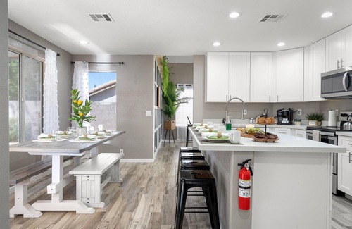 Welcome to our private escape in North East Mesa! Located right near the 202 for easy access to all local amenities, this beautifully-updated property is the perfect retreat for family gatherings, golf trips, bachelor/ette celebrations, or just a relaxing getaway. In the breathtaking backyard, enjoy the luxurious setting complete with a pool, fire pit area, putting green, shuffleboard court, and more. You'll find yourself just a short walk away from a local park to go enjoy the outdoors. The home itself has 5 bedrooms and 2.5 bathrooms, plus thoughtful design touches throughout.