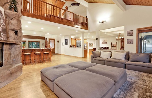 The upstairs loft features a pool table and a remote workstation. The multi-family room has a smart TV, firestick arcade, and triple bunks for maximum sleeping space. The master suite boasts a king bed, fireplace, and private spa bathroom. The downstairs master suite also includes a king bed and fireplace, enter the garage and find a large loft area converted mudroom and laundry facilities nearby. The converted garage bonus room offers reclining theater chairs, a projector screen, ping pong, and foosball.