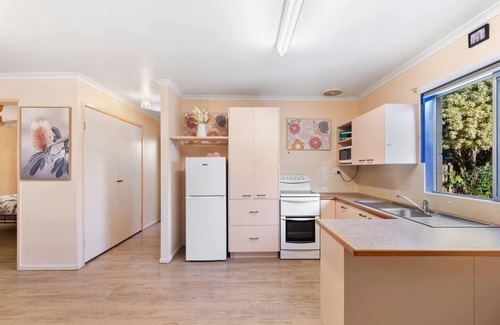 Sleep easy within the queen-sized bedroom. It’s set with side tables, reading lights and storage space for your belongings. A ceiling fan helps to ensure a cool night’s sleep. Rinse off after the beach in the outdoor shower or refresh within the neat bathroom. Internal laundry facilities add to your holiday convenience and include a washing machine and drying rack.