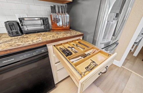 Fully equipped kitchen (air fryer coffee maker, electric kettle, coffee, tea, decaf coffee, sugar, powder creamer, gas stove, oven, microwave, refrigerator, dishwasher, cookware, chef's knives, pots, pans, saucepans, cutting boards, roller pin, and various utensils and culinary tools)